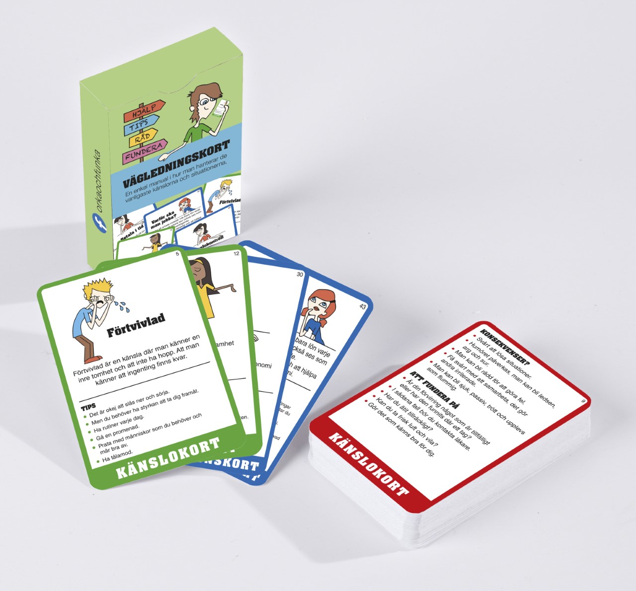 Modellen "Stopp, Stanna, Tänk efter och Ta itu" utgör den praktiska kärnan som vägleder användaren till effektivare hantering av stress och motgångar. Produktöversikt och InnehållEn ask innehåller 52 kort uppdelade i två kategorier: Korttyp Antal Färgmärkning Innehåll och funktion Känslokort 20 st Grön/Röd Beskriver känslan, ger gröna TIPS för hantering och påminner om konsekvenser (röd baksida) om man agerar impulsivt.